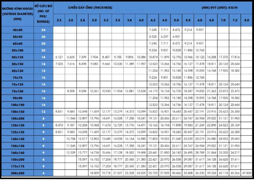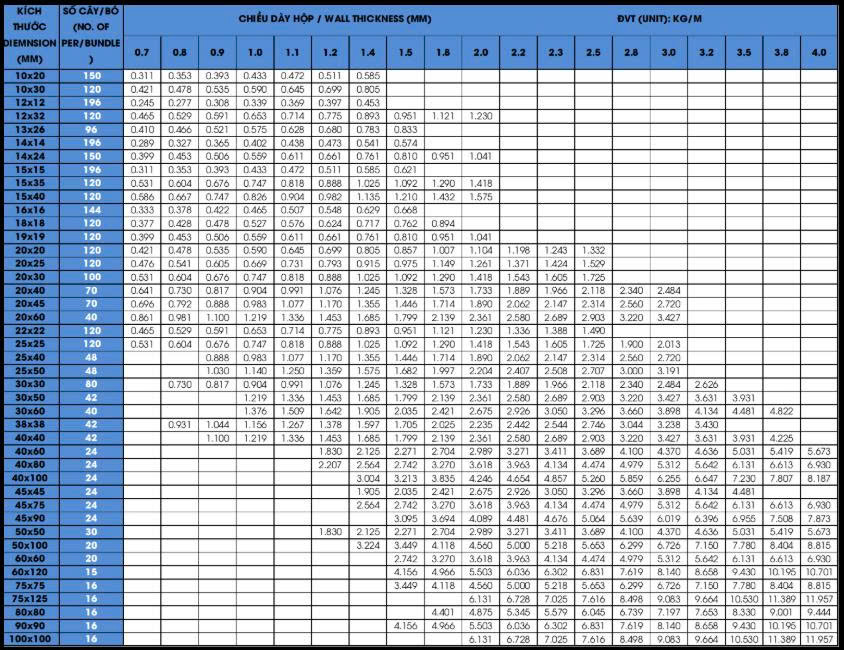 Bảng quy chuẩn trọng lượng các loại thép hộp vuông, chữ nhật mạ kẽm