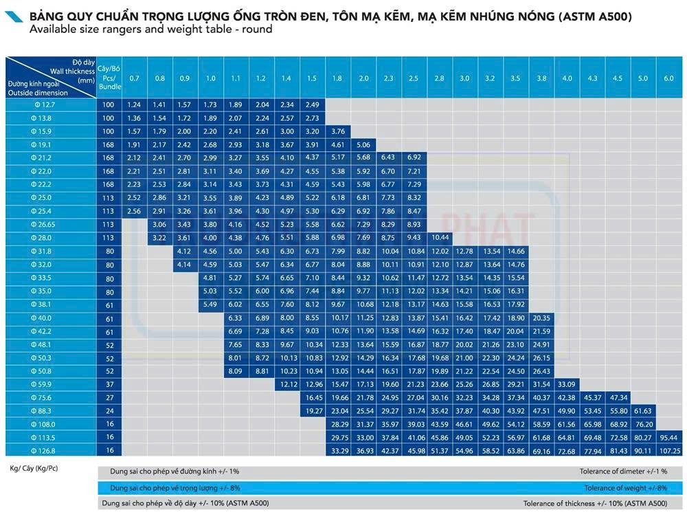 Bảng tra trọng lượng ống thép mạ kẽm theo tiêu chuẩn ASTM A500